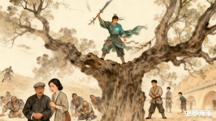 忽然老槐树的枝杈“啪”地抽过来,把家丁全扫落在地。