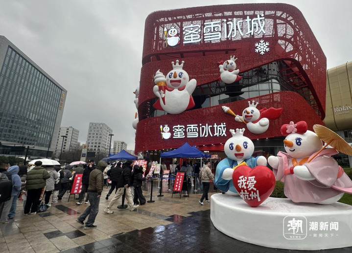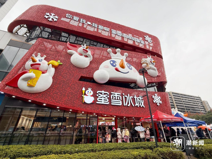 记者在现场看到,这家门店独占西溪银泰城外围一栋建筑,为红色多层弧形结构,外立面布满大小不一的雪东谈主造型,搭配雪花遮盖与醒盘算“蜜雪冰城”白色logo,极具视觉冲击力。尽管选址不在市中心中枢商圈,却依然引诱巨额粉丝慕名前来打卡。