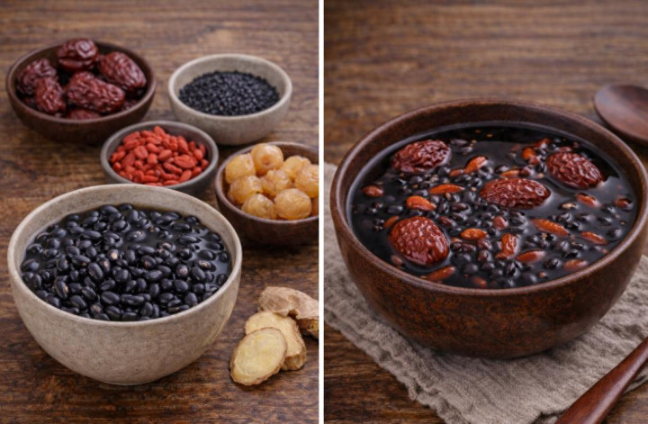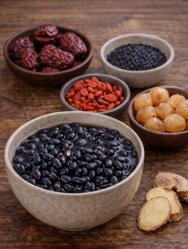 先把黑豆提前浸泡4小时以上,泡到微微裂口为佳。锅中加入净水,放入黑豆和生姜,大火煮开后转小火慢煮30分钟。接着放入红枣和黑芝麻,再煮15分钟,终末关火前加入枸杞焖5分钟即可。