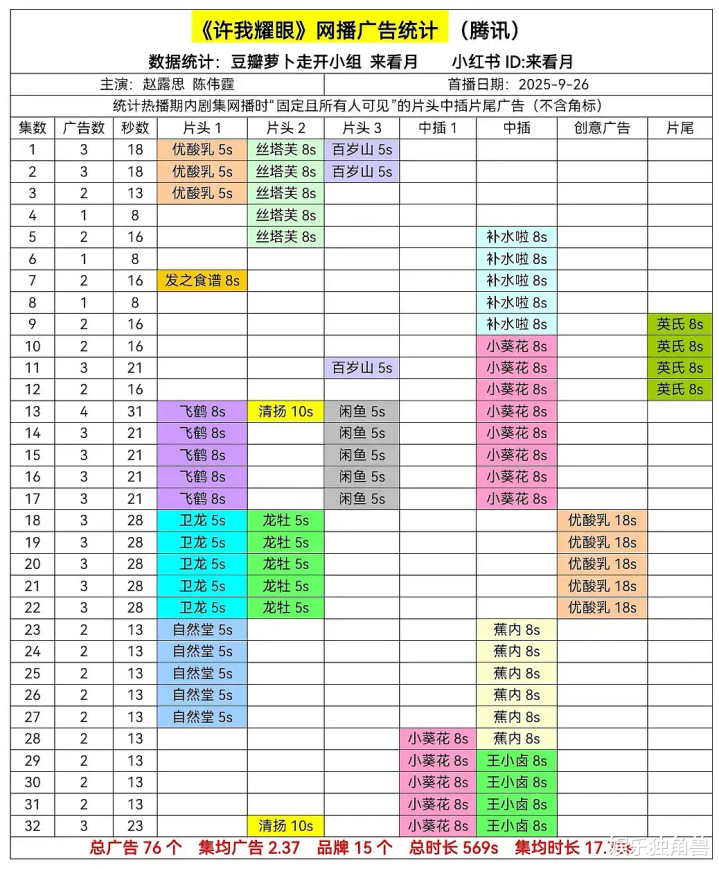 天然内容市集为“黑马”欢欣若狂,但成本市集频频阐明出一定的“滞后性”。在各大榜单霸榜的《许我疑望》,在招商榜上却不算“疑望”:20个品牌数、91个告白、集均7广,放在本年的招商市集只可说是20名开外。巧合这也与该剧主要播出期在国庆长假、热播期短等要素关联,留给品牌的反映时期并未几,也难以复刻此前品牌在剧爆后火速追加投放的盛景。