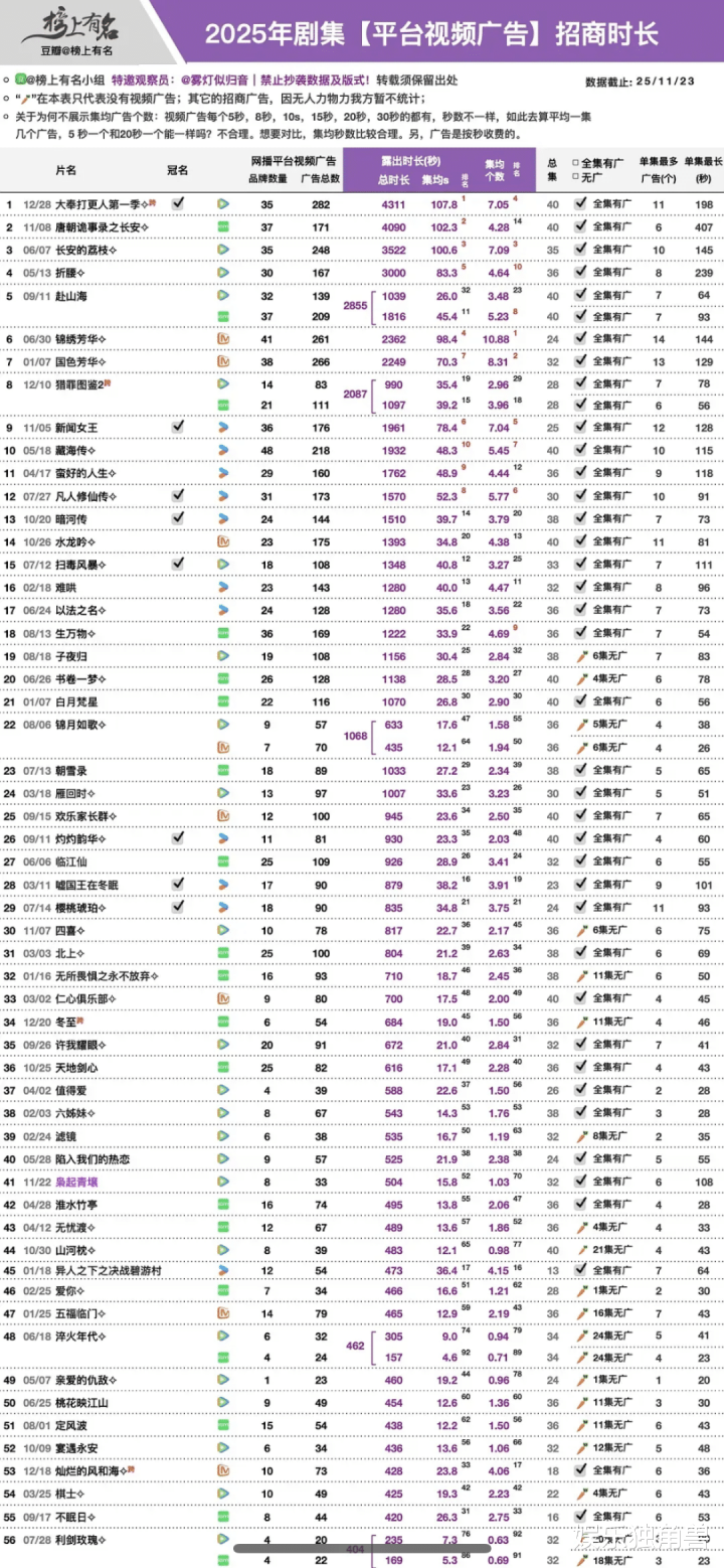 在豆瓣榜上著名小组发布的2025剧集平台视频告白招商时长统计表中,总时长TOP60的剧荟萃兑现全集有广的剧达到40部,前18名均兑现了全集有广。其中《大奉击柝东谈主》《新闻女王2》《凡东谈主修仙传》《扫毒风暴》等9部剧拿到了总冠名,来自裸播的怯怯正在隔离剧集市集。
