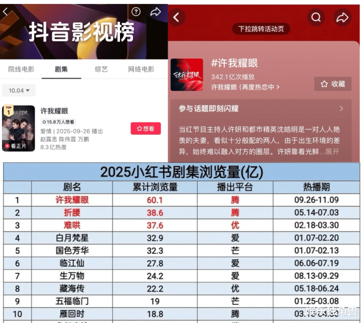再者,剧集“出圈”渠谈更丰富。《许我疑望》在猫眼上热度不显,但抖音的断层之势也印证了她的爆款之路,是短视频时期的典型;《藏海传》则是微博热度的杰出人物,“野生编剧”造梗掀翻全网追剧海潮。至于其他的,还有《难哄》《漂白》之于抖音,《垂头》之于小红书等。