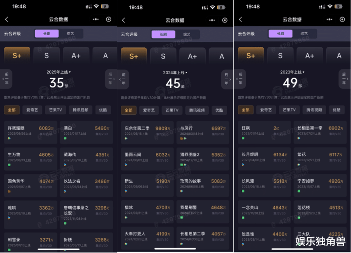 《藏海传》是优酷剧王,是云合、猫眼、灯塔等全网播放量冠军;《许我疑望》是腾讯视频剧王,云书籍均TOP1,在小红书、抖音上断层登顶;《生万物》是爱奇艺剧王,多平台日峰值年冠/史冠;《国色青春》是芒果剧王……