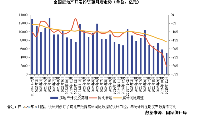 1—11月份,世界房地产开发投资78591亿元,同比下落15.9%,降幅高于同期新址销售额4.8个百分点。单看11月,开发投资额为5028亿元,同比下落30%,降幅较10月扩大7.3个百分点。