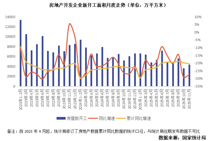 前11月房屋新开工面积5.3亿遍及米,下落20.5%。其中,住宅新开工面积3.9亿遍及米,下落19.9%。11月新开工面积4396万遍及米,同比下落27.6%,同比降幅缩小1.9个百分点。