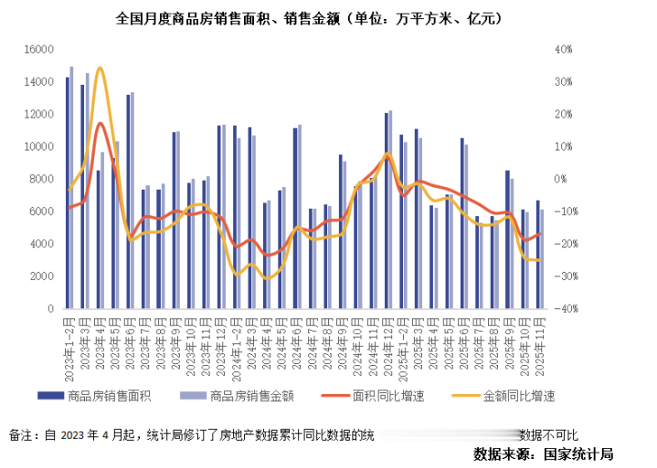 12月15日上昼,国度统计局按时发布2025年11月宏不雅经济和房地产数据。国民经济稳步增长,社零同比增速出现回落。地产行业方面,因行业正处于转型发展的要害时间,再加之上年基数上升的影响,销售规模、房价、投资、国房景气指数均延续调解。不外从具体城市和形态的角度来看,新址价钱、形态去化率等方面仍存有结构性亮点,行业供求压力也在握续好转。