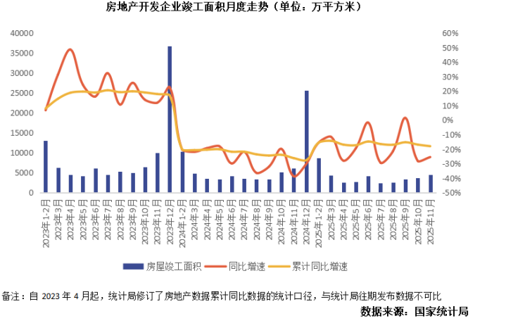 2025年前11月,世界房屋齐全面积达3.9亿遍及米,同比下落18%,降幅较前10月扩大1.1个百分点;11月单月齐全面积4593万遍及米,同比下落25.5%。从单月走势来看,尽管11月齐全面积同比仍处下落区间,但行业齐全量已呈现周期性回升态势,反应出各地正握续发力激动保交房责任。尽管齐全面积与新开工数据因统计口径不同不具备径直可比性,但从同比增速变化可了了看出积极信号:年内齐全面积攒计同比降幅甩手在20%以内,显赫小于三年前新开工面积超30%的同比降幅,这充分证实面前形态化险、保交房责任正获得实效。这一进展也得到计谋层面印证——12月召开的中国经济年会上,中央财办副主任明确默示,本年以来重点领域风险化解奏效显赫,方位政府隐性债务置换有序激动,保交房任务已全面完成。