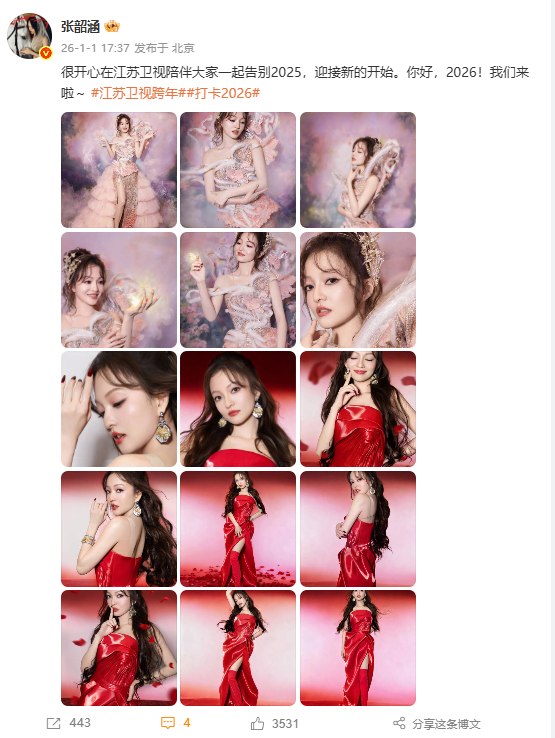 张韶涵以廓清 “铁肺” 嗓音出说念,早年凭《欧若拉》《隐形的翅膀》奠定唱将地位,比年跨年晚会的舞台造型常以 “梦境丽都” 出圈,总能把歌曲气质揉进妆造细节里。2026 年元旦,她在江苏卫视跨年晚会后发布这组动态,两种作风的造型,刚好对应着她舞台里的 “梦境与强烈”。